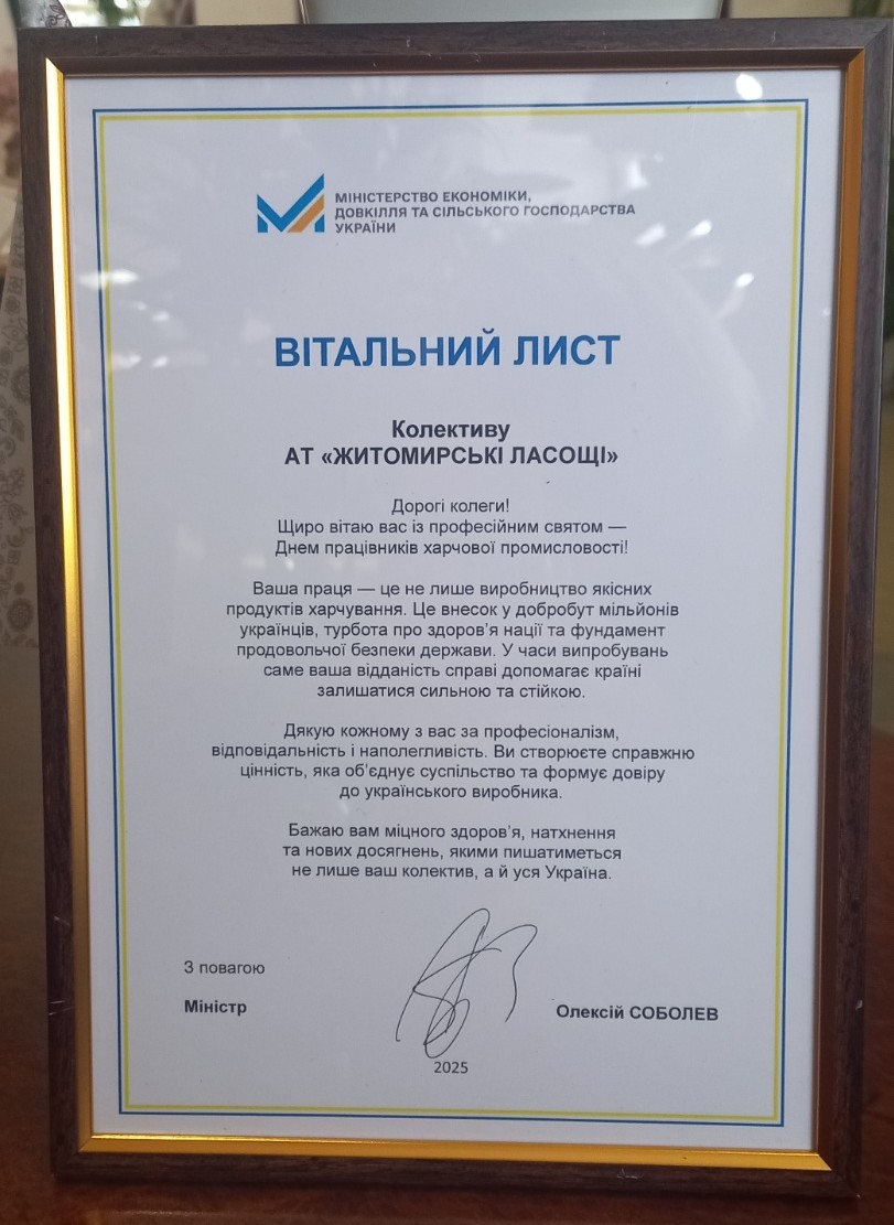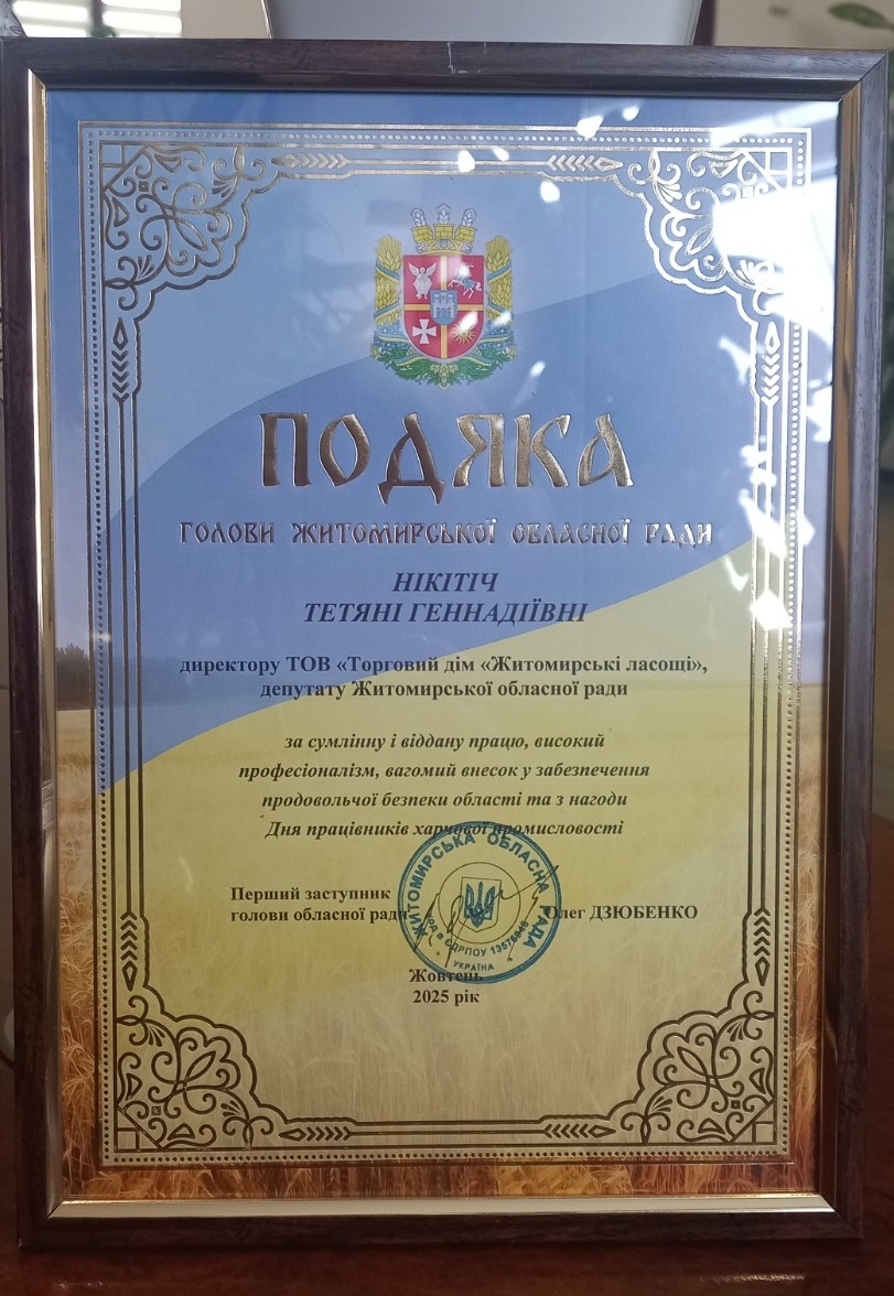 We sincerely thank the Zhytomyr Regional State Administration for the initiative and the opportunity to join the event, which unites the government and business for the development of the food industry of Ukraine.