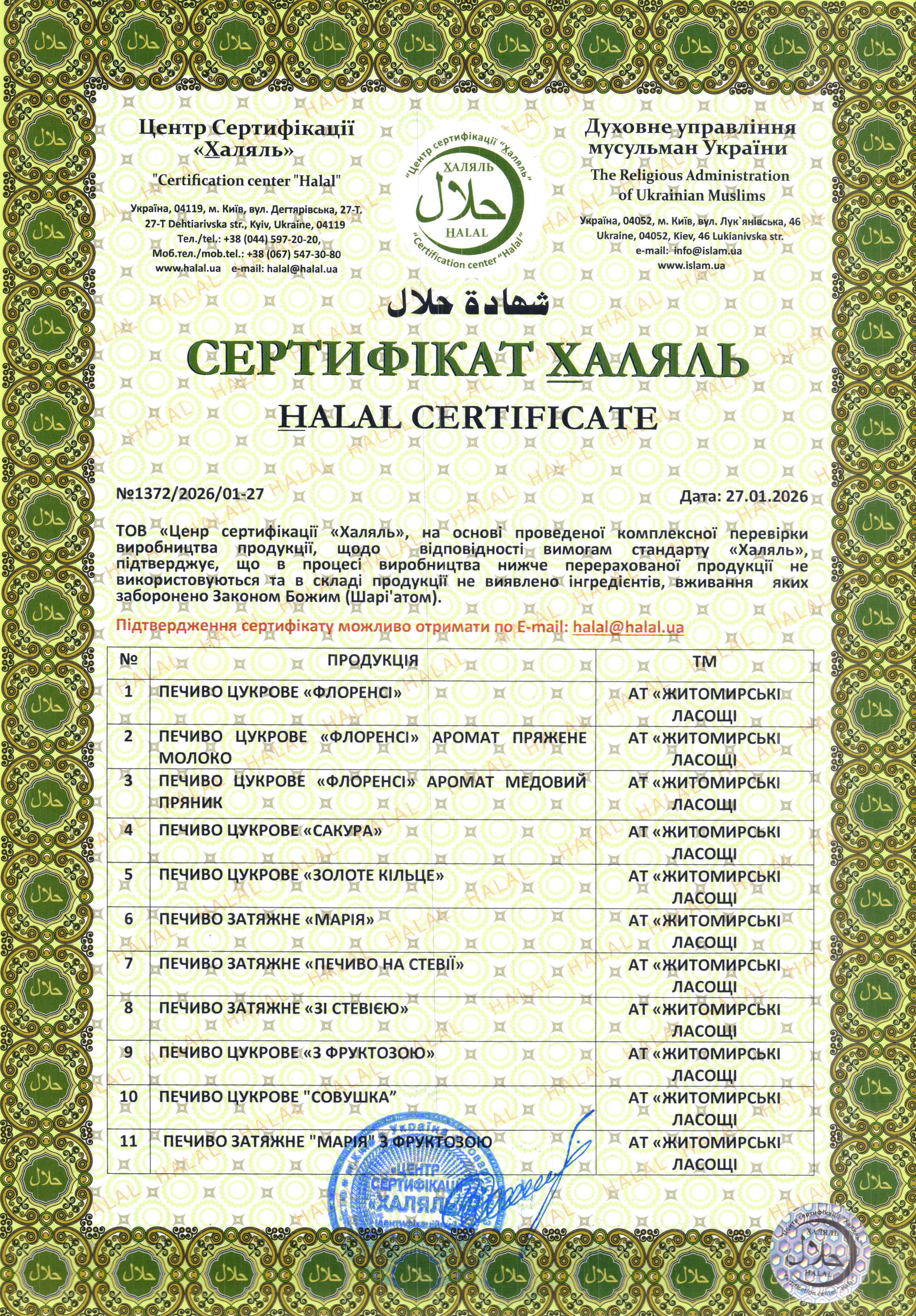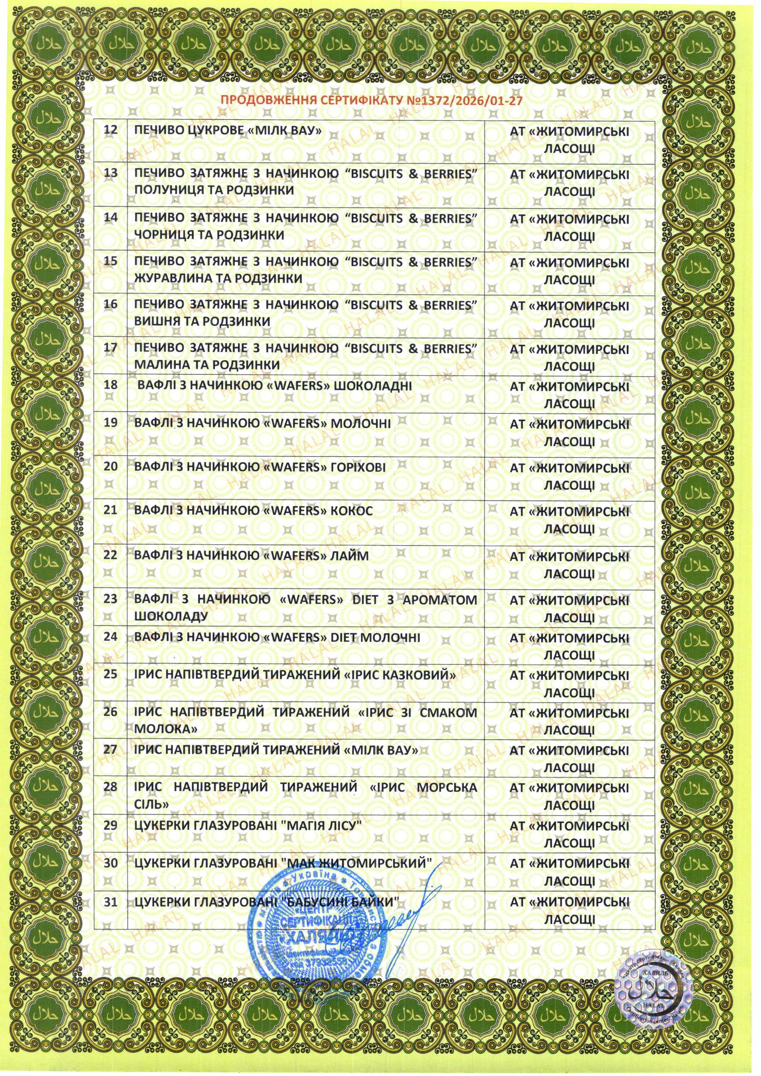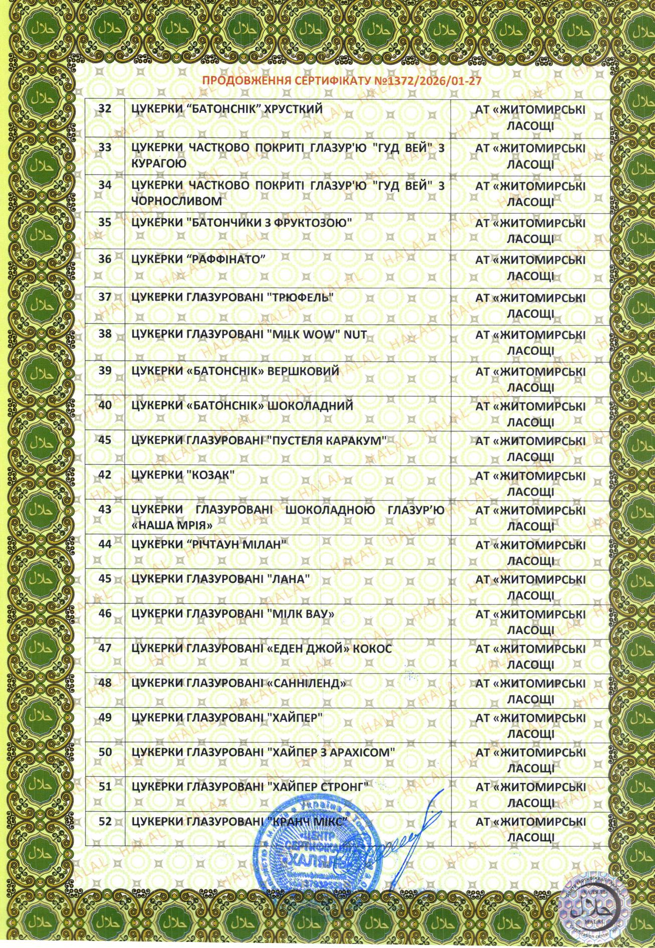 Підприємством впроваджені сертифіковані інтегровані системи управління якістю і безпекою харчових продуктів, відповідно до вимог міжнародних стандартів ISO 22000 і FSSC 22000, що дає можливість продажів солодощів під брендом «Житомирські ласощі» у торгові мережі багатьох країн світу. Виробництво продукції відповідно до норм ісламу підтверджено сертифікатом «Халяль».